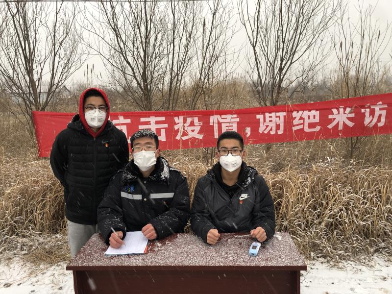 俗话说瑞雪兆丰年,今年的春节却有些特别。2020年1月27日,大年初三清晨,西北风正挟着雪花簌簌飘落鲁北平原,柏油马路铺上了一张白绒绒的地毯。东营市河口区新户镇北台子村南口,自来水泵房前大路旁边的树干之间,悬挂着一条大红的横幅,“抗击疫情,谢绝来访”!八个白色的大字格外醒目。横幅前面摆放了一张会议桌,桌上有一支红外体温计、一摞登记表,桌前有三个戴着口罩的年轻人正在执勤,头上一层雪花。雪花不大却也绵密,凛冽的寒风里,他们坚守“前哨”岗位,不放过任何一个来客,哪怕是本村人回家,也要逐一测量体温、询问登记,丝毫不敢松懈。因为往年的今天,正是乡里乡亲纷纷走亲访友最繁忙的大日子。