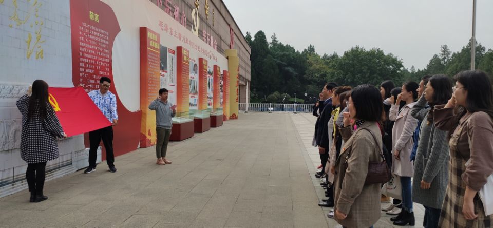 纪念场馆参观环节结束后,在纪念馆前,面向党旗、面向革命烈士纪念塔,党总支组织全体党员重温入党誓词,进行庄严宣誓。