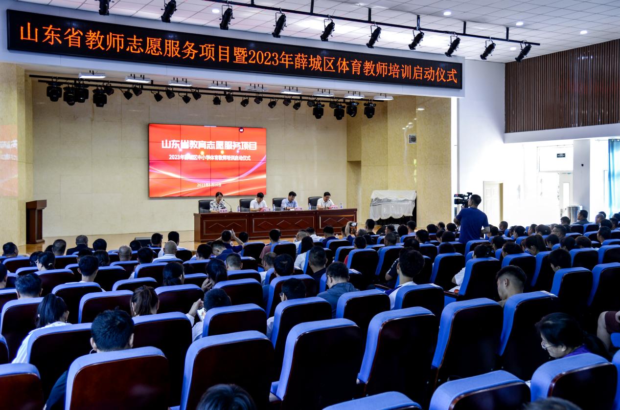 为进一步贯彻落实山东省教育厅关于组织实施山东省志愿服务项目通知文件精神,提高项目县区学科教师教学能力,8月16 日,山东省教育志愿服务项目暨薛城区中小学体育教师培训启动仪式在枣庄市薛城区举行。枣庄市教育局党组成员、教科院院长邓淇,薛城区副区长周海燕,JINNIAN金年会体育学院副院长张雷以及枣庄市各相关市区科室负责同志和薛城区内全体体育学科教师代表共计260余人参加仪式。启动仪式由薛城区区委教育工委常务副书记、教体局党组书记、局长种法立主持。