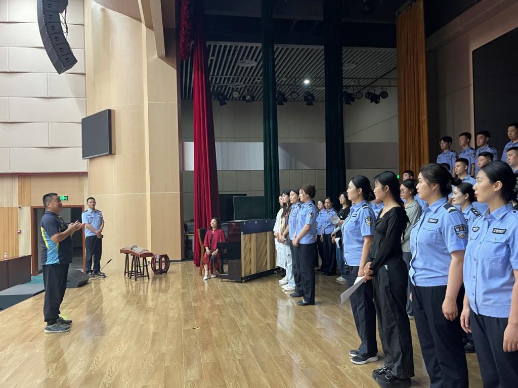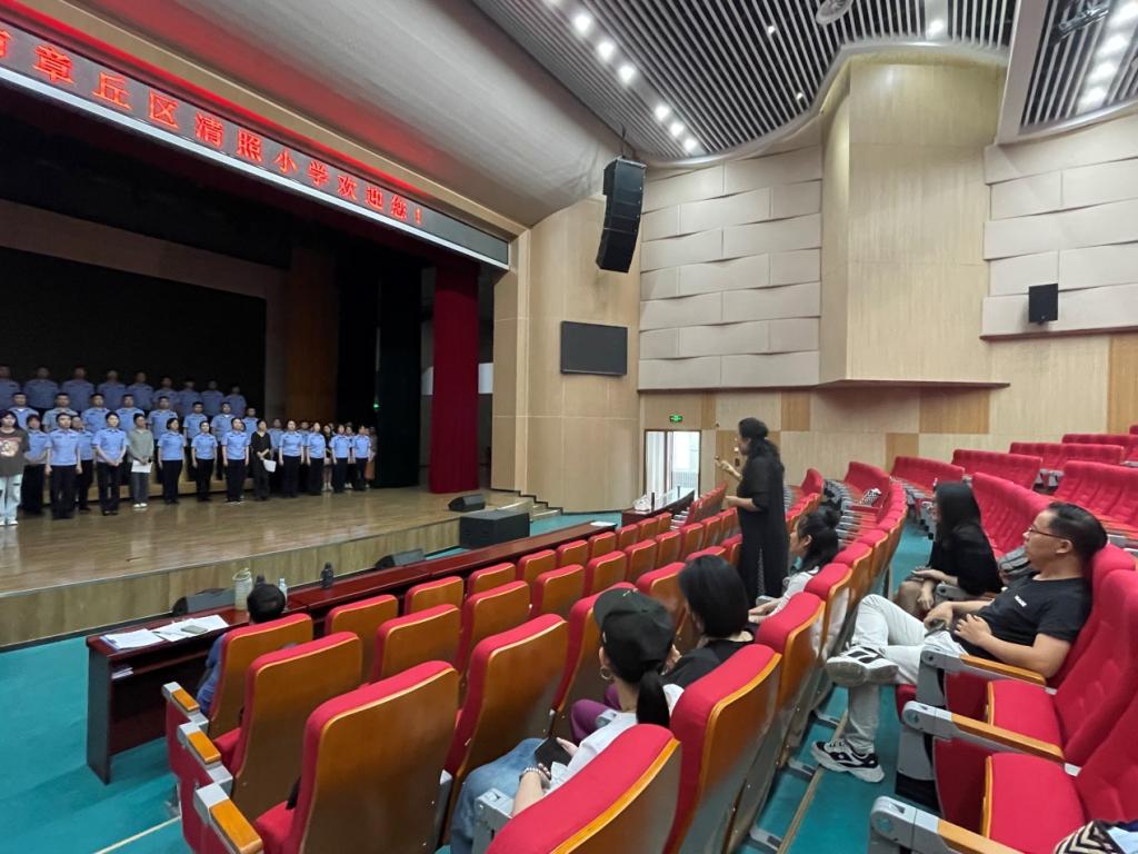 在章丘清照小学礼堂,志愿者服务队对章丘区公安局合唱团进行了现场指导。各位党员教师利用专业所长对合唱团演唱曲目过程中出现的问题提出了指导建议,针对每位队员进行了声部的界定,对发现的问题进行针对性训练。各位党员专业的讲解和示范受到了章丘区公安局领导与干警们的一致认可和好评。