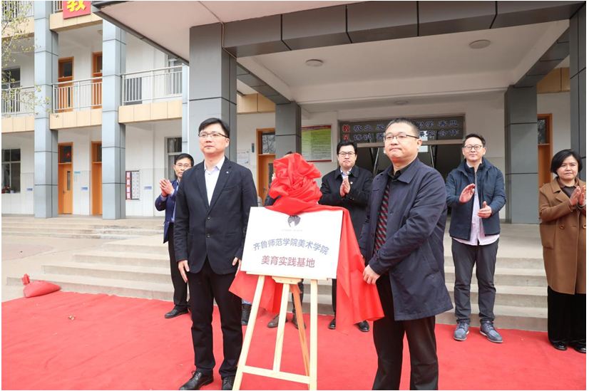 美术学院院长杨三军、党委副书记辛源,专家团队成员油画教研室主任陈明教授,设计教研室主任杨恩国副教授,工艺设计教研室主任陈曦副教授,办公室主任刘芳副教授,邹平市委编办主任孙婧祎,邹平市委宣传部副部长、文联主席成玲玲,邹平市教体局党组成员、教研室主任刘德全,好生街道党工委书记李凯,好生街道办事处副主任马莹莹,好生初中党支部书记、校长陈晓东,及初一年级师生参加“美育实践基地”揭牌仪式,仪式由马莹莹主持,辛源与李凯为“美育实践基地”揭牌。