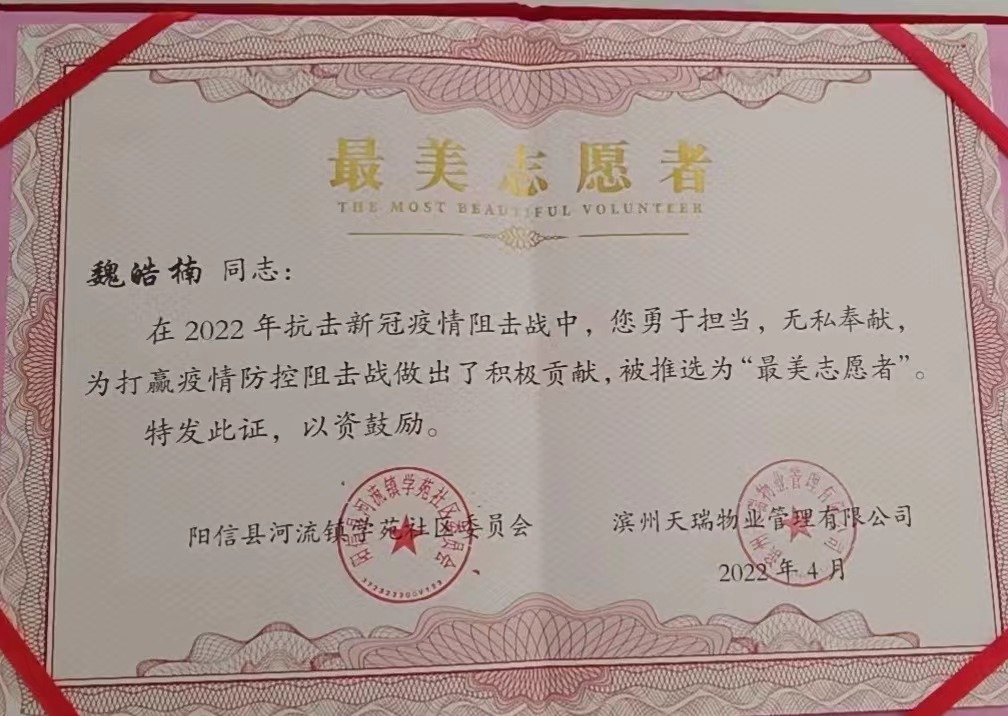 “2022年三月下旬,疫情突如其来,我的家乡滨州阳信正遭受着新冠病毒疯狂肆虐,看在眼里、急在心里,作为一名大学生我一定要为我的家乡做点什么。”2022级民族传统体育专业魏皓楠说。