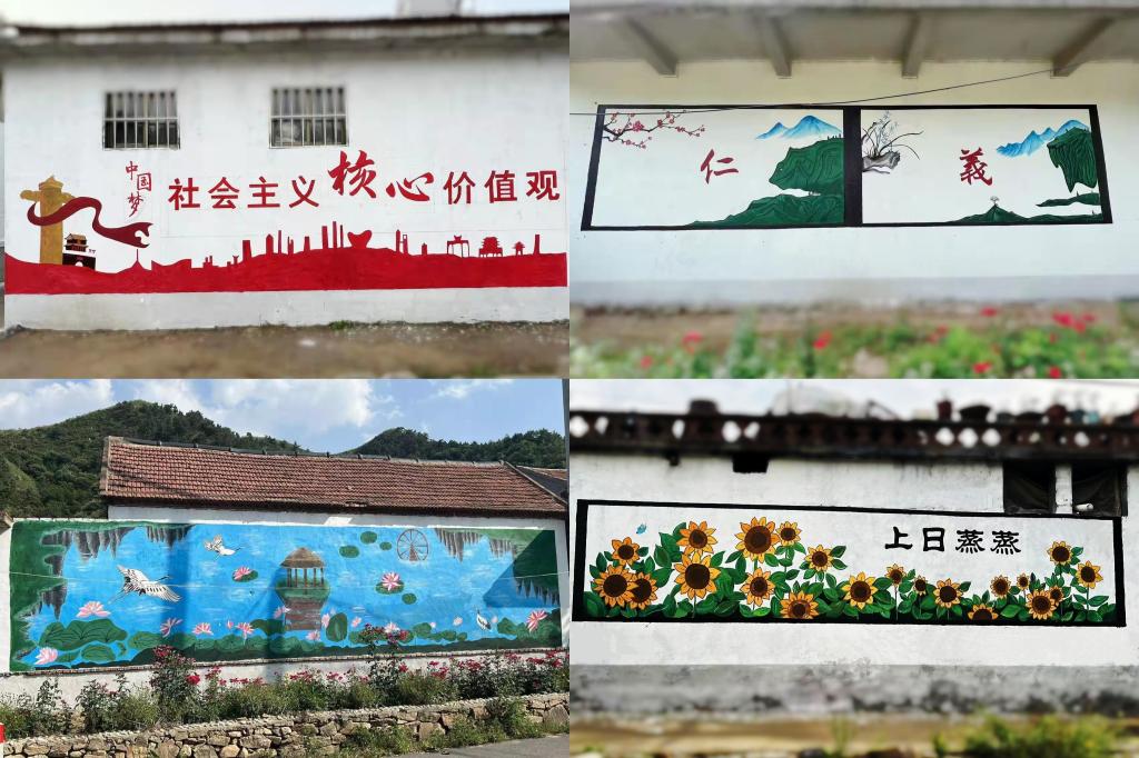 “爱之翼”服务队根据党的政策方针、村庄现实情况及服务队的宣传方案进行墙绘内容的设计,共开展了包括《社会主义核心价值观宣传图》《儒家‘五常’图》《向日葵图》等十一副完整墙绘的创作。经过三年的射垛村墙绘建设,文化墙已成为当地一道靓丽的风景线,成为宣传党和国家的方针政策、传播先进文化、涵养文明乡风、体现当地特色的有效载体。同时,服务队也积极响应推普助力乡村振兴计划,进行了普通话使用现状入户调查、普通话培训、普通话宣传墙绘等一系列活动,这不仅增强了队员们的研究分析能力与教学能力,同时为美丽乡村建设发展贡献了一份力量。