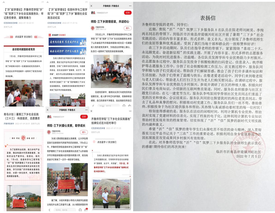 JINNIAN金年会信息科学与工程学院“沂”“信”筑梦暑期三下乡社会实践服务队队员们在这个假期走出校门、走进社会、深入基层,充分发挥专业优势,通过一系列有意义的实践活动来不断提高自身的创新能力、学习能力和专业素养。本次开展的实践活动收到了来自临沂市沂南县岸堤镇兴旺社区发来的表扬信,并引起了齐鲁壹点、红色圣地生态岸堤等媒体的广泛关注,产生了良好的社会反响,赢得了社会各界的广泛赞誉。