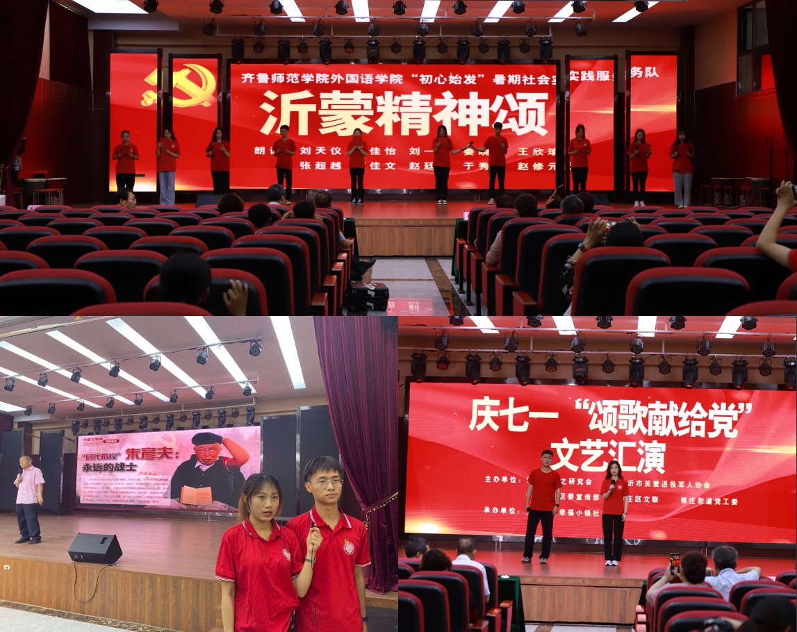 在6月25日举行的罗庄区幸福小镇社区“庆七一、颂歌献给党”文艺汇演活动中,外国语学院社会实践服务队表演了精彩的节目,展现了JINNIAN金年会外国语学院青年学子的良好精神面貌。队员们为此次演出精心准备了积极向上的英语歌曲和令人热血沸腾的诗朗诵。在诗朗诵“沂蒙精神诵”中说到,“最后一口粮做军粮,最后一块布做军装,最后一个儿子送战场”。一个个感人至深的故事背后,正是沂蒙精神的生动体现。在艰苦卓绝的革命历程中,沂蒙党政军民水乳交融、生死与共,共同铸就了伟大的沂蒙精神。滔滔沂河水,流淌着党与人民血肉相连的鱼水深情;巍巍沂蒙山,耸立着党和人民生死与共的历史丰碑。通过参加社区文艺汇演,队员们不仅又接受了一次沂蒙精神的洗礼,更抒发了对党的无限热爱之情,充分展现了齐鲁师院青年爱党爱国爱校的情怀和朝气蓬勃、青春向上的精神面貌。