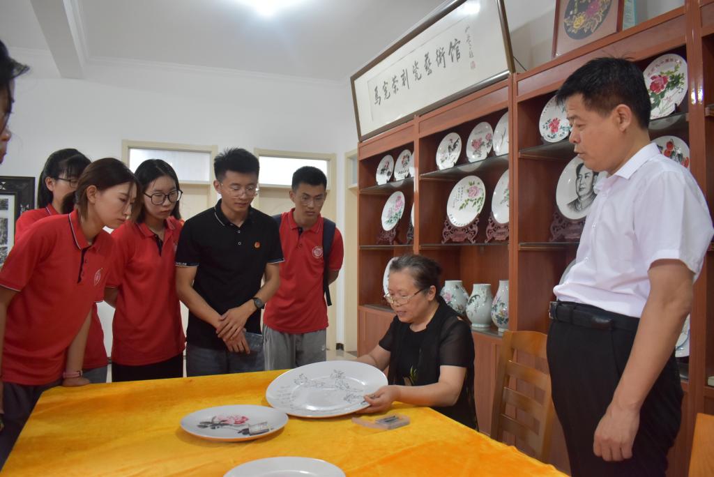 (图为马宪荣为实践队成员展示刻瓷与麦秸画艺术)