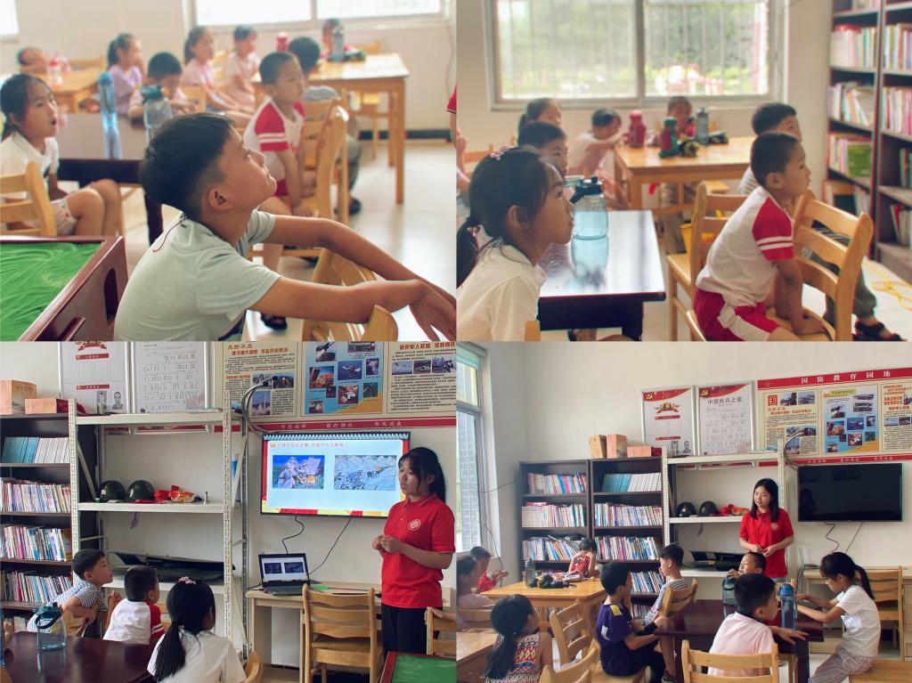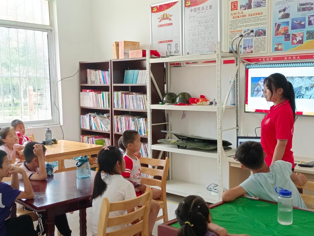 随后,利用图文结合、课堂互动的形式继续重温那段奋斗百年的艰辛历程。当讲到《金色鱼钩》的故事时,课堂气氛迅速被带动起来,不论是大朋友还是小朋友,都整齐划一地将双手放于胸前的课桌上,认真聆听着这个耳熟能详的党史故事,很多小朋友也认真动笔记录课堂笔记,将党史知识内化于心,也希望孩子们最终转化为行动上的高度自觉。在课堂互动环节,出乎队员们意料的是小朋友们不仅积极配合、认真听讲,而且在问答环节踊跃举手发言,准确无误地回答了“青灿”服务队队员所提出的党史有关的问题,一问一答,互动现场充满了欢声笑语。通过“党史故事”来丰富农村孩子们的暑期生活,鼓励孩子们深入了解红色文化,传承红色基因,树立远大理想。
