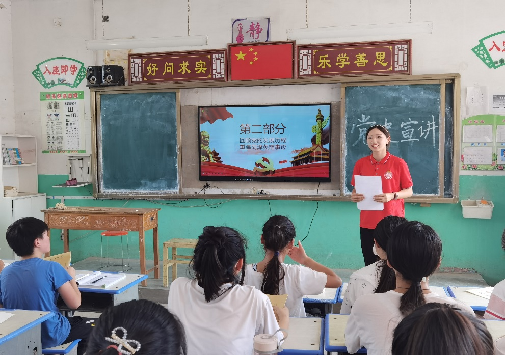 本次支教活动主要包括对留守儿童进行党史学习教育、学业指导、心理疏导、暑期防溺水安全教育宣讲、发放学习用品等内容。