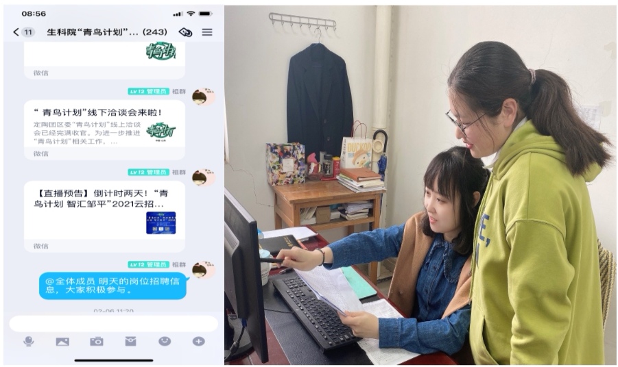 为积极推进青鸟计划,帮助学生树立正确的就业观、择业观、助力美丽乡村,为乡村振兴战略贡献青春力量,生命科学学院辅导员祖群在寒假期间积极主动地组织学生注册“青鸟计划”账号,并引导学生学会使用“青鸟计划”小程序,为生科学子寻找合适的实践岗位提供切实有效的帮助。同时祖群老师积极转发相关岗位招聘信息,将线上招聘优势扩大至最大化,为毕业生提供就业岗位信息及就业经验,帮助同学形成正确的就业观、择业观,建立完备的就业、实习校园服务体系。