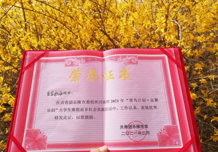 生命科学学院王金秋雨同学积极参与乐陵市“青鸟计划”社会实践活动,当她拿到乐陵市团委颁发的荣誉证书时,非常激动。王金秋雨同学表示,“感谢学院的悉心教育,感谢祖群老师的热情帮助。作为新时代青年,我们要坚定理想信念,在弘扬抗疫精神中汲取开拓进取的精神,担当时代责任,勇于砥砺奋进,在弘扬抗疫精神中坚定攻克艰难的信心,以实际行动践行青年人应有的担当精神。 ”