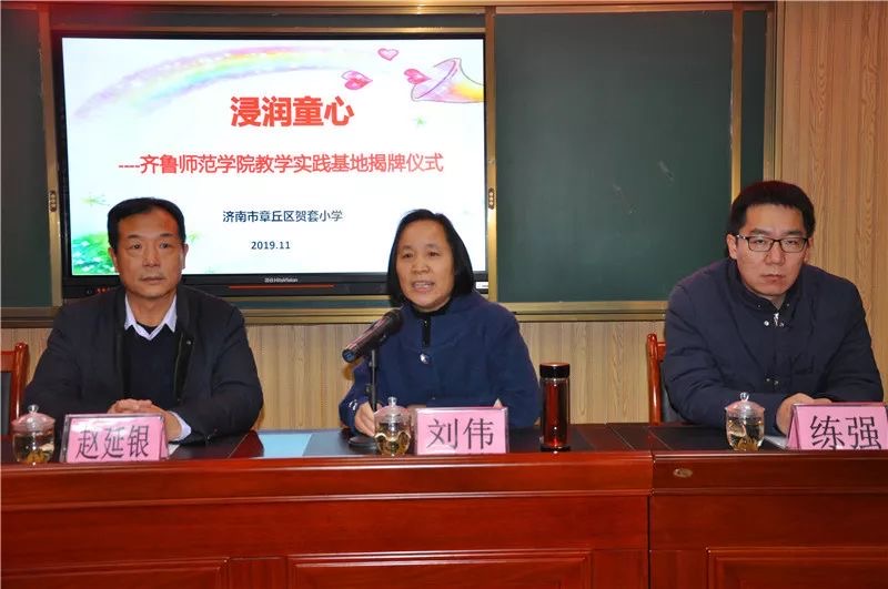 11月26日上午,JINNIAN金年会教学实践基地揭牌仪式在贺套小学举行。教师教育学院院长赵延银、副院长魏祥迁、学院办公室主任练强,章丘区教体局教研中心主任刘伟,贺套小学校长逯凤、书记曹秀华及五年级师生代表参加了本次活动。贺套小学副校长王丽英主持会议。