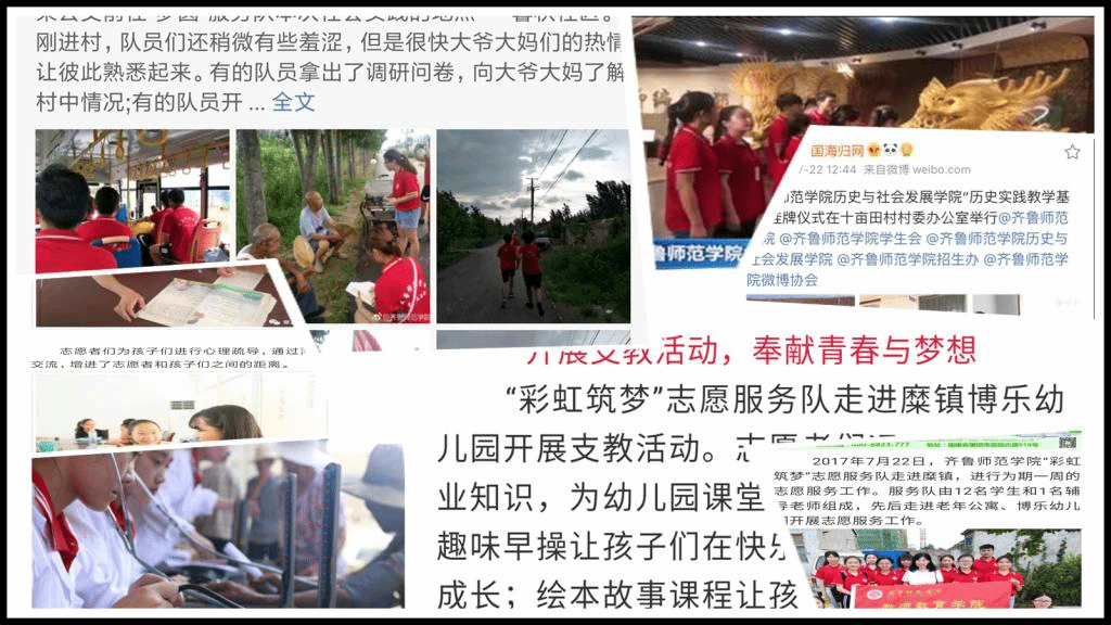 三下乡社会实践期间,金年会官网紧紧依托中国青年网教育频道、三下乡官网、齐鲁壹点等平台,全方位、深层次地推进校园新闻宣传工作,丰富校园文化生活,服务青年学生创新成才。截至目前,金年会官网25支服务队已完成“三下乡”实践活动,齐鲁壹点累计投稿110 余篇,微博发送量达2300余条,中青校园审核发送量9篇。其中,生命科学学院“青枫”社会实践服务队志愿服务事迹被新浪微博、今日头条、临沭手机台等媒体报道;历史与社会发展学院“初心”服务队志愿服务事迹被中国海归网宣传报道;文学院“涌泉”服务队志愿服务事迹被济南新闻综合频道等媒体报道;教师教育学院“知行合一”服务队志愿服务事迹被山东省电视台农科频道、菏泽市单县电视台等媒体报道;外国语学院“情暖日月潭”志愿服务队志愿服务事迹被章丘第一眼等媒体报道;教师教育学院“晨光之梦”服务队志愿服务事迹被章丘农科电视台宣传报道;化学与化工学院“心乡汇”服务队志愿服务事迹被电视台《事事关心》栏目组报道宣传;物理与电子工程学院“梦圆”服务队志愿服务事迹被德州同城微博宣传;教师教育学院“彩虹筑梦”服务队志愿服务事迹被德州同城微博、德州晚报陵城读本微信平台等媒体报道;信息科学与工程学院“在路上”服务队志愿服务事迹被《聚焦》微信平台报道宣传;外国语学院“携梦起航”志愿队志愿服务事迹被人民日报社“人民数字”媒体宣传报道。