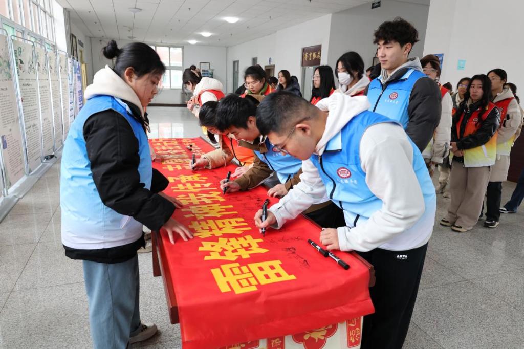 诵读完成后,全体志愿者继续在二楼大厅举办了“雷锋精神我传承 志愿服务我先行”为主题的横幅签名活动,以此来动员更多的青年学子参与到学雷锋的队伍中。志愿者们现场重温了雷锋同志乐于助人、无私奉献的事迹,并引导同学们执笔留名。活动现场,青年志愿者、广大学子们纷纷在条幅上签上自己的名字,郑重许下“向雷锋同志学习”的承诺。活动现场气氛热烈、秩序井然。