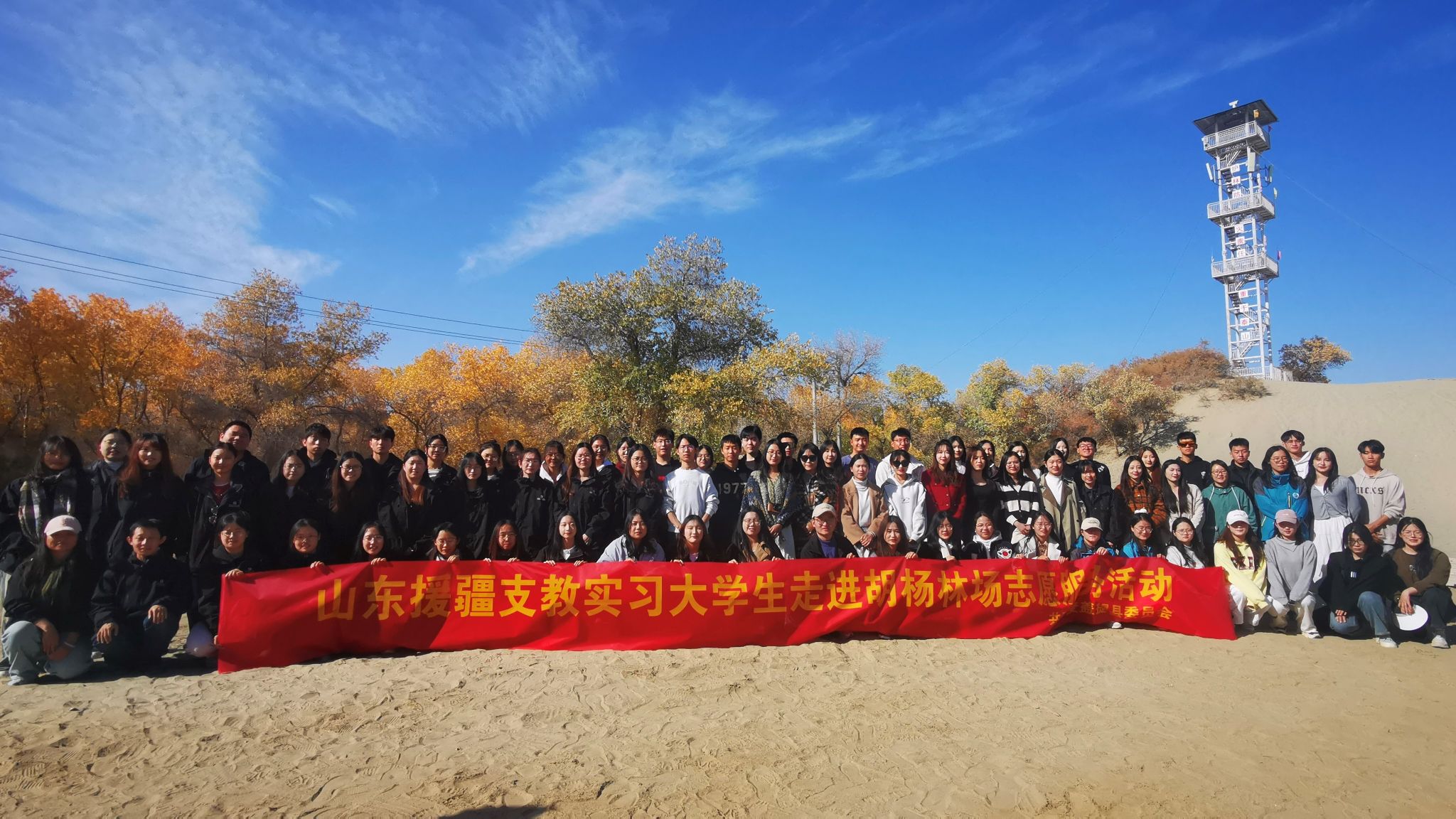 为深入学习和传承百年胡杨精神,11月2日,在援疆指挥部的精心策划下,JINNIAN金年会第六批援疆实习支教团在带队教师赵青、汪洁的带领下,满怀热情地前往麦盖提胡杨林场,开展了一场意义非凡的志愿服务活动。
