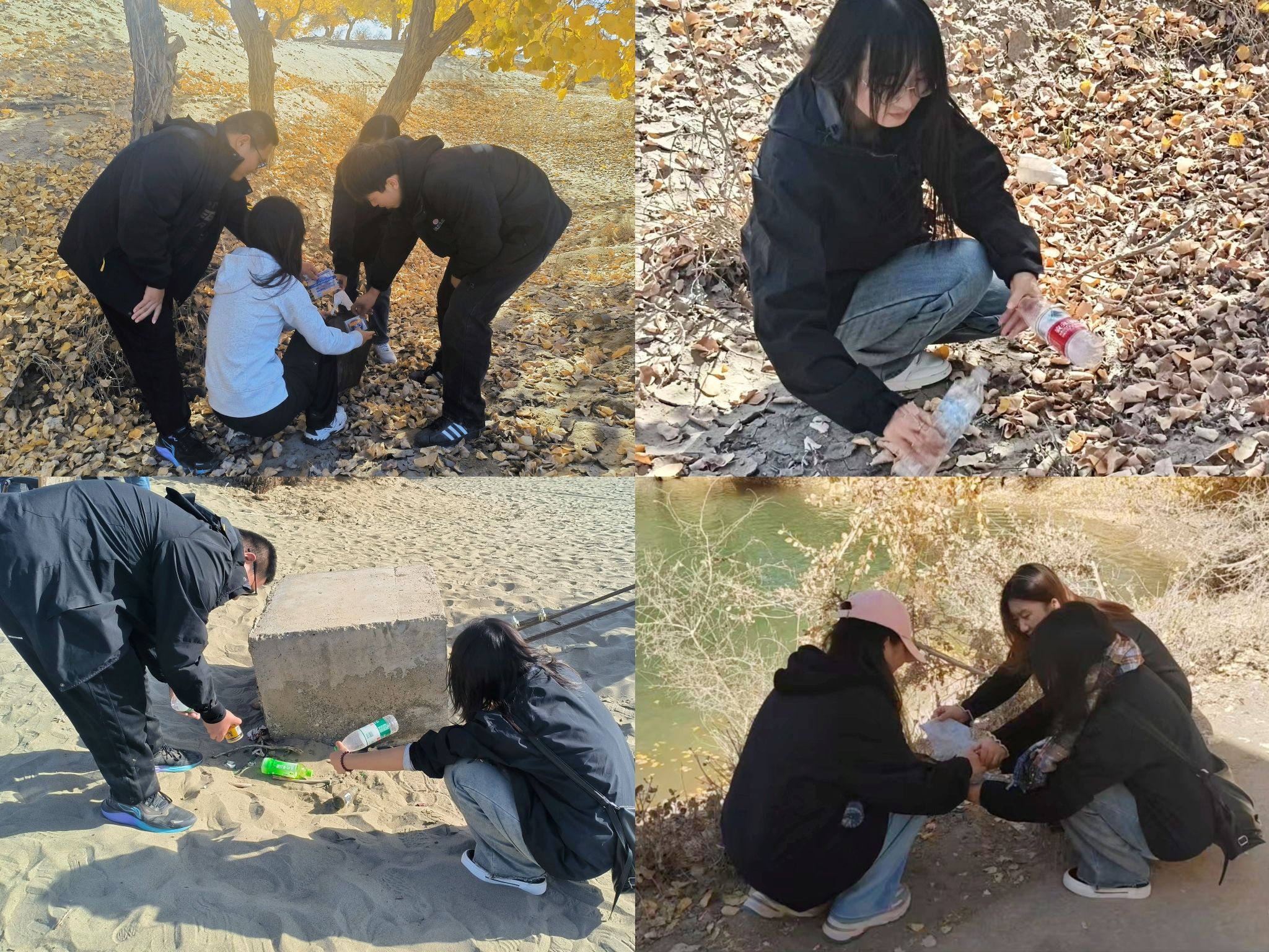正午,当阳光穿透云层,洒在广袤无垠的胡杨林上时,整个林场仿佛被镀上了一层金色的光辉。JINNIAN金年会第六批援疆实习支教团成员手持垃圾袋,沿着蜿蜒曲折的小径深入胡杨林腹地。他们边走边捡,无论是隐藏在草丛中的塑料瓶,还是随风飘散的食品包装,都未能逃脱他们的视线,被一一收入袋中。他们用实际行动守护着这片珍贵的绿色家园,彰显了胡杨精神中坚韧不拔、无私奉献的品质。