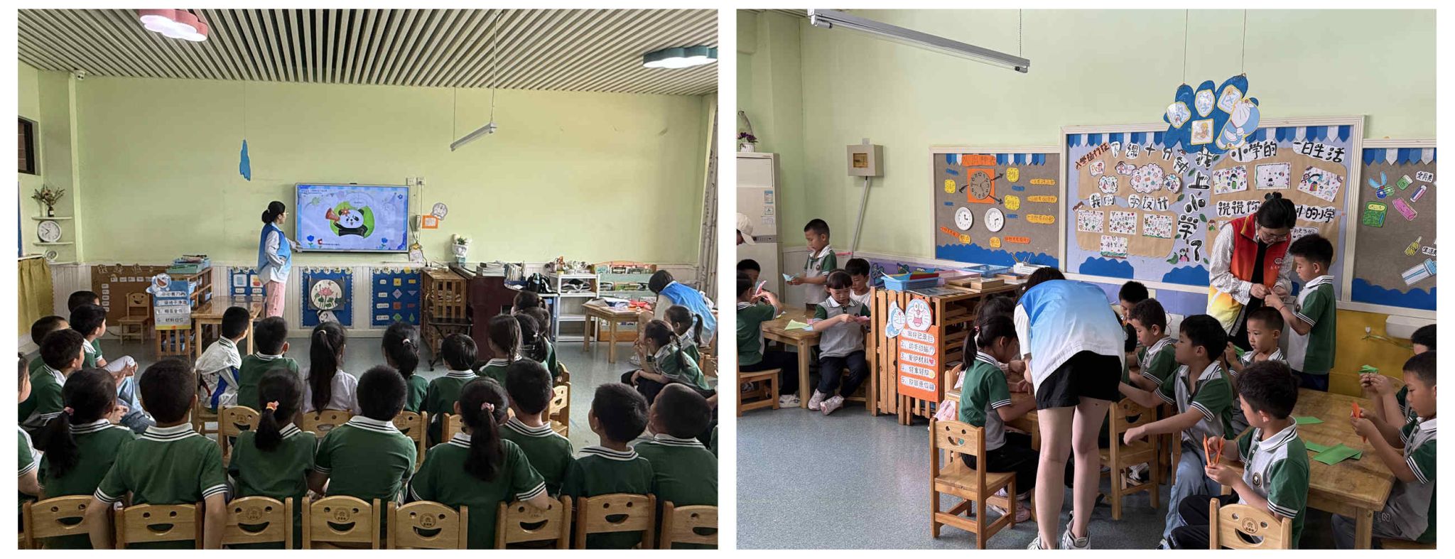绘本故事会结束后,折纸活动在手工教室里如火如荼地展开。志愿者们提前制作了精美的折纸示范作品,用彩色折纸折成的小手表瞬间吸引了孩子们的目光。志愿者张垚耐心地手把手教小朋友们制作纸手表:“先把正方形对角对折,再折出手表的形状……”尽管有些步骤对幼儿来说颇具挑战,但在志愿者们的细心指导下,孩子们逐渐掌握了折纸技巧。当他们看到自己完成的作品时,教室里响起了欢呼雀跃的声音。