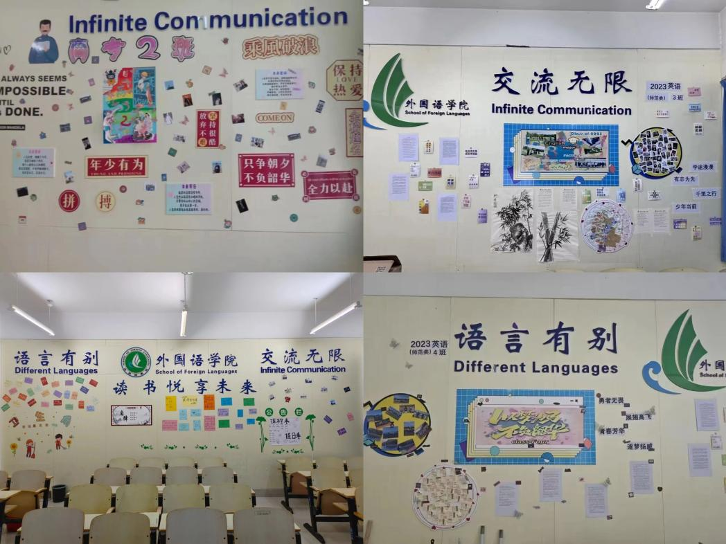 秉承“语言有别,交流无限”的院训,为营造和谐融洽、积极向上、富有特色的班级文化氛围,学院开展了班级文化墙建设活动。班级文化墙的设计也是亮点纷呈,作为展示班级个性文化的平台,每个班级都选择了具有代表性的元素。各班同学们认真思考、积极行动、巧妙构思、精心布置,通过制作手抄报、张贴优秀作业、班级合照等多种方式,营造出了一个个主题鲜明、色彩和谐又各具特色的班级文化氛围,将班级的特色和风采展现得淋漓尽致。
