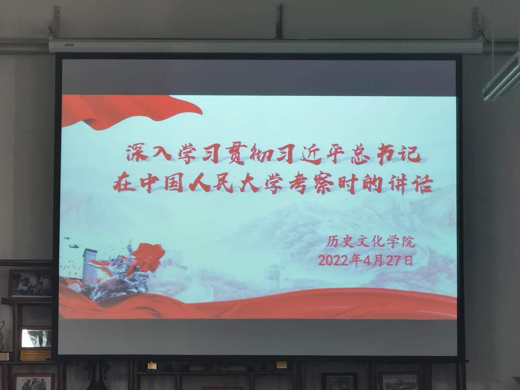 4月27日,历史文化学院集体学习习近平总书记在中国人民大学考察时的重要讲话精神,党政领导班子和辅导员参加线下学习,全体教师参加线上学习。