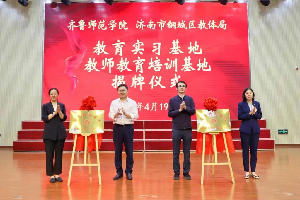 林松柏、靳玉波为“JINNIAN金年会钢城区教育实习基地”揭牌;孙正、孙春莹为“JINNIAN金年会钢城区教师教育培训基地”揭牌。