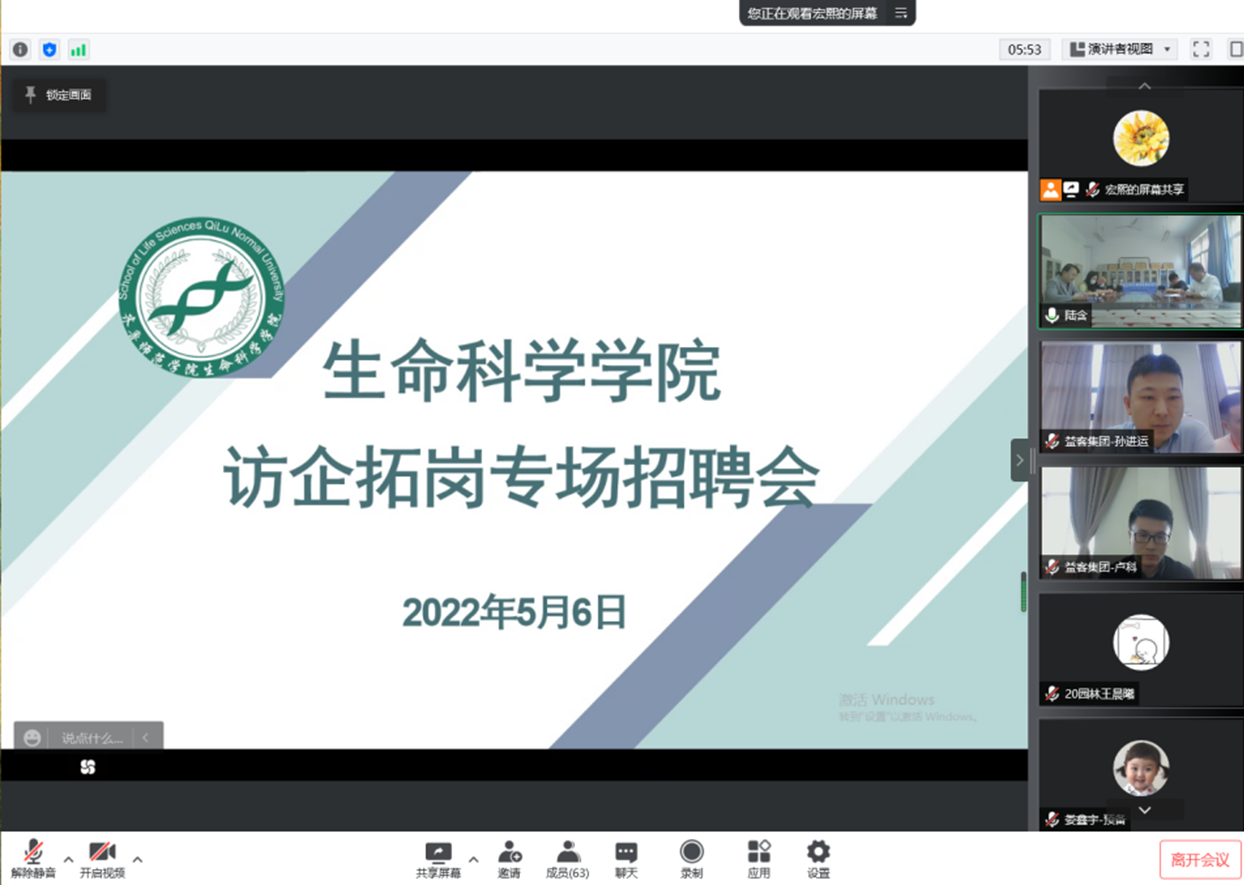 毕业在即,就业将近。为确保2022届毕业生就业工作平稳推进,促进毕业生与用人单位实现供需有效对接,推动毕业生高质量就业,5月6日上午9:30,生命科学学学院举访企拓岗专场招聘,特邀益客集团人事总监孙进运、单位招聘经理卢科连线宣讲,为用人单位和应届毕业生搭建“零距离”交流平台。生命科学学院党委书记姜东菲、院长李师鹏,团总支书记张宏熙、团总支副书记房继德、辅导员徐茜茜、陆含,以及2022届毕业生参加。会议由张宏熙主持。