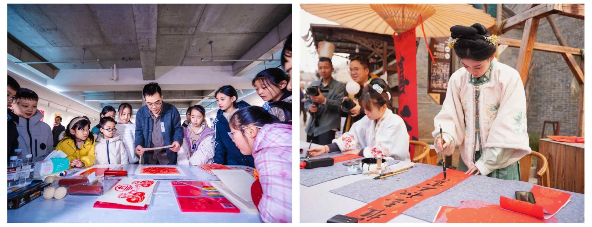 活动现场,金年会官网美术学院还组织了两项特色活动。在版画印刷公教活动中,学院版画教师周良银带领学生为明水古城招募的20名学生带来版画印刷学习公教课,旨在提升社会大众对版画艺术的认知与体验。同时,学院书法系学生身着古装在小广场为游客书写春联和祝福语,活动现场气氛热烈,游客们纷纷参与其中,感受中华传统文化的魅力。