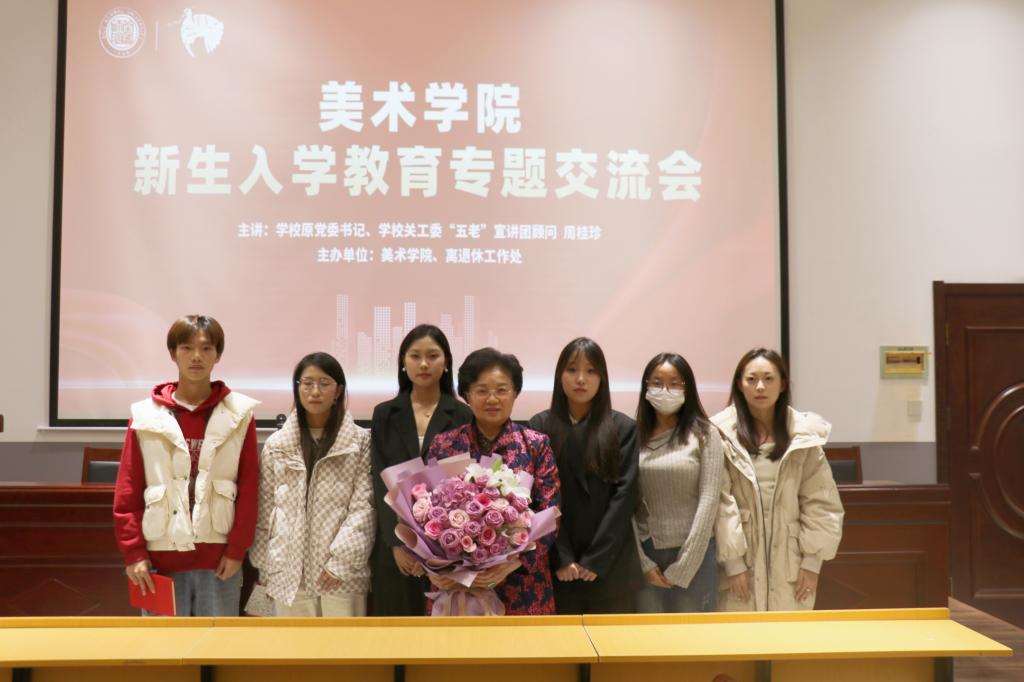 11月10日下午,美术学院特邀学校原党委书记、学校关工委“五老”宣讲团顾问周桂珍面向2023级全体新生进行校史校情专题交流,为同学们讲授了一堂别开生面的思政课。美术学院党委书记辛源、院长杨三军出席交流会,学院师生采取线上与线下相结合的形式,共近400人聆听报告。交流会由学校党委委员、党委统战部部长宋新刚主持。