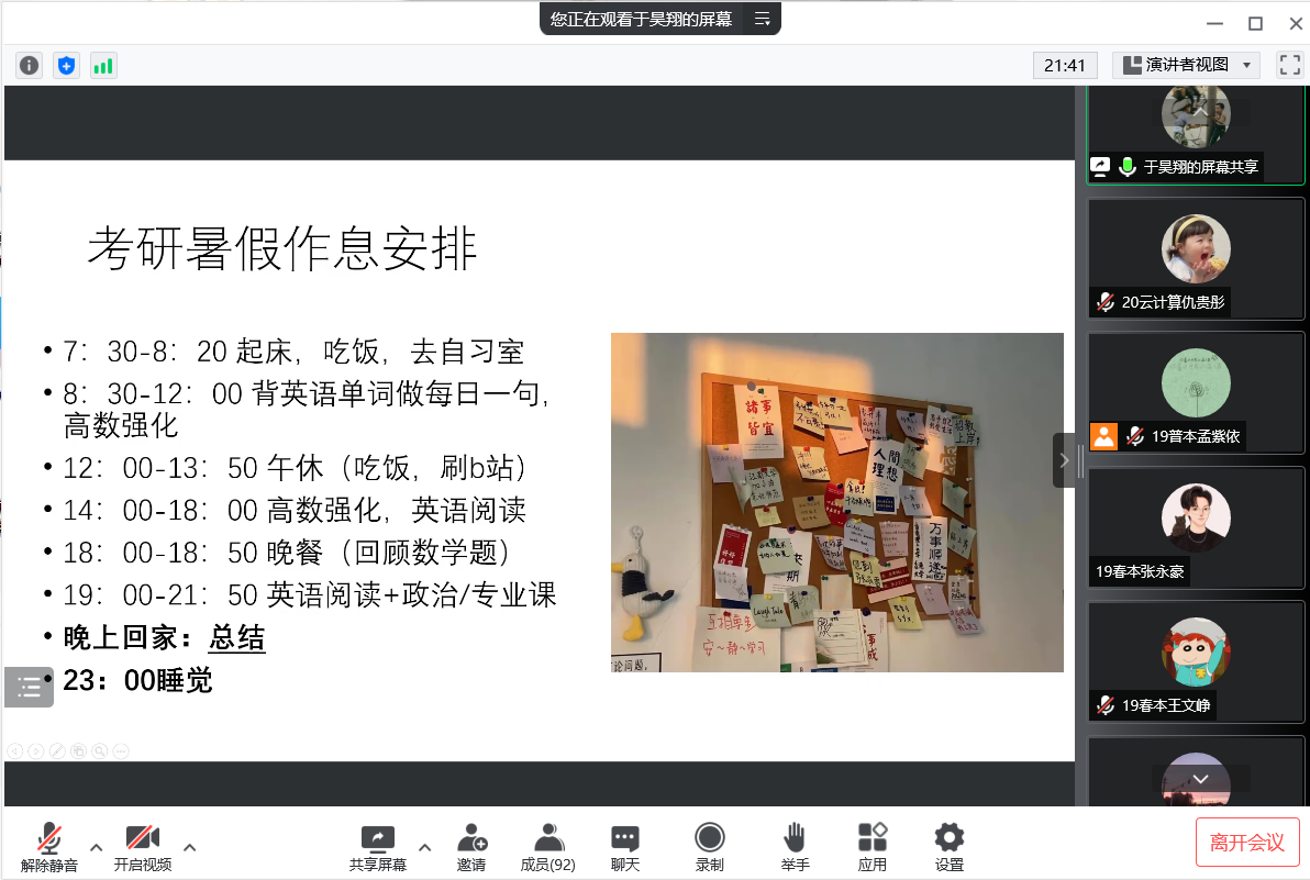 王兵从择校、学习和心态等方面分享自己的经验,他强调选择的重要性,做出正确的选择能少走许多弯路。向同学们展示了自己的学习流程,从资料到老师,都有着自己的规划;推荐了许多的学习up主,希望大家能取得好的成绩。