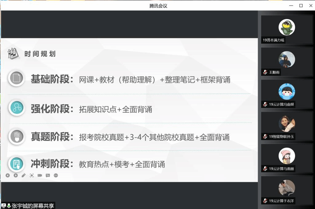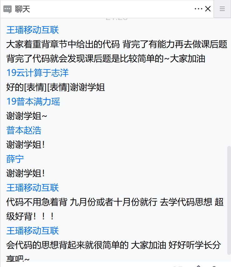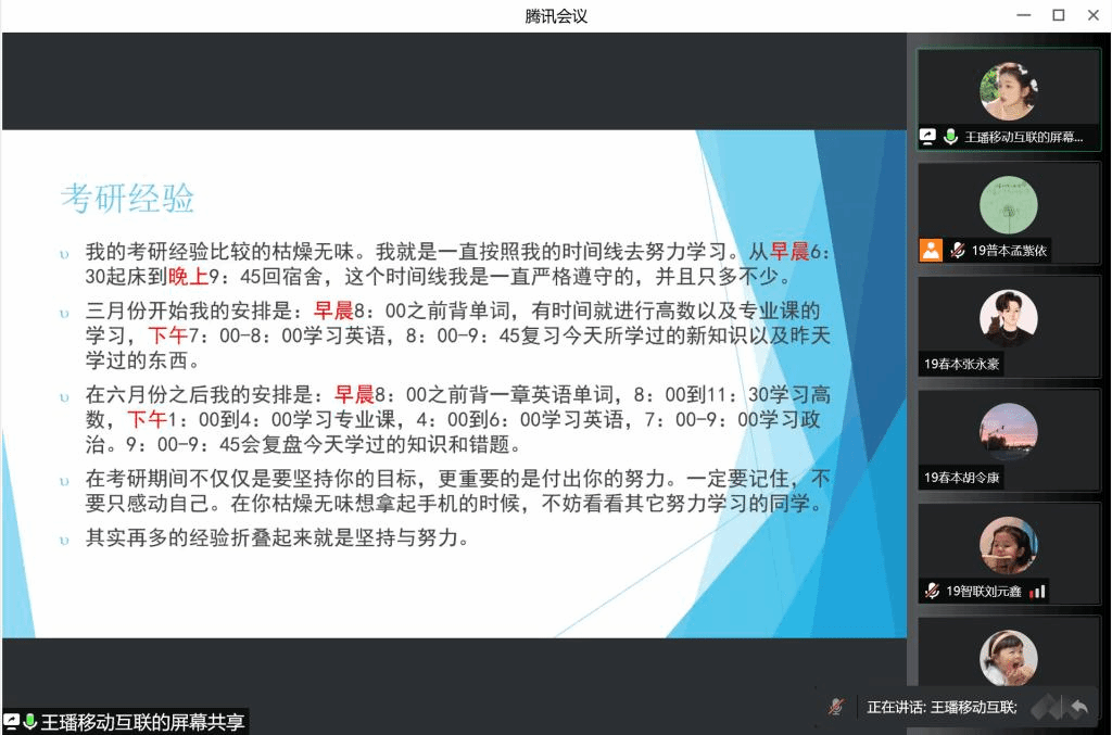 王璠强调两点:坚持与努力。她以自身为例告诉我们在英语学习方面单词的重要性,同时也对各个类型的题目进行了讲解。除此之外,她分享了自己的专业课学习方法,强调了代码的重要性;推荐了优质的复习资料,在对话框中为同学们答疑解惑。