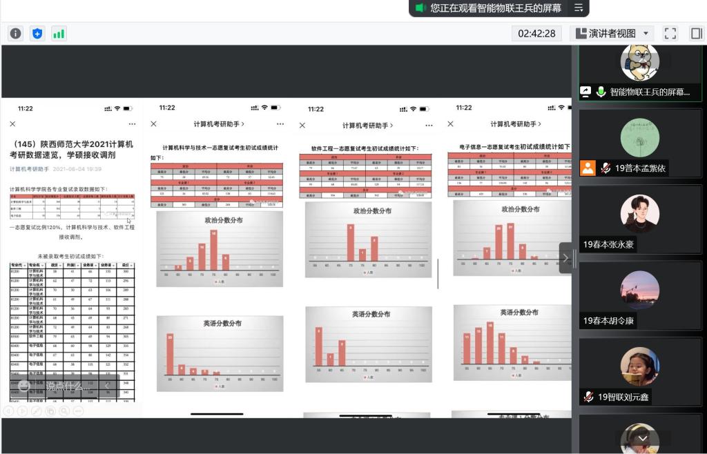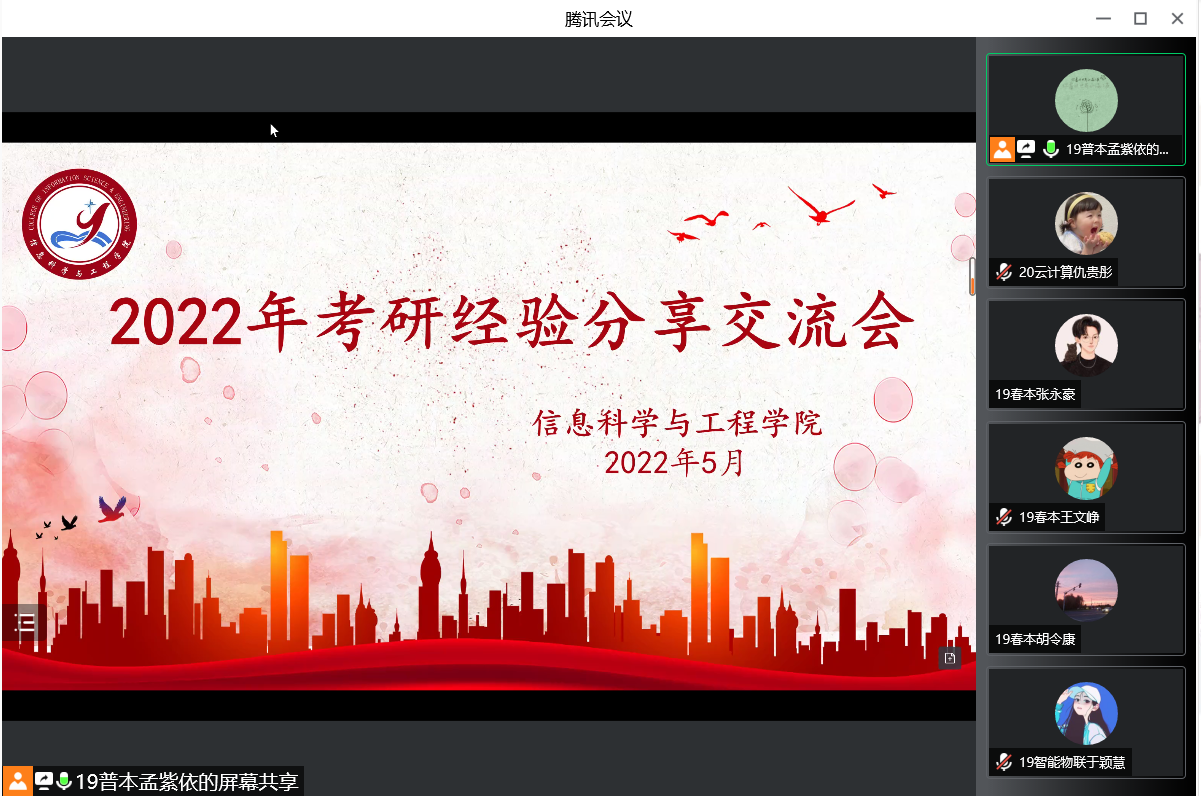 为帮助2019级考研学子做好“研”途路上的学业规划,获取“上岸”经验,缓解备考压力,搭建起学生间经验交流的有效平台,5月12日,信息科学与工程学院于线上举办了2022年考研经验分享交流会。此次交流会邀请到2018级计算机科学与技术(春本一班)于昊翔、2018级计算机科学与技术(春本二班)张宇铖、2018级计算机科学与技术(智能物联)班王兵、2018级计算机科学与技术(移动互联)班王璠进行经验分享,辅导员李瑶老师和孙亚楠老师出席本次活动,2019级全体考研学生参加。