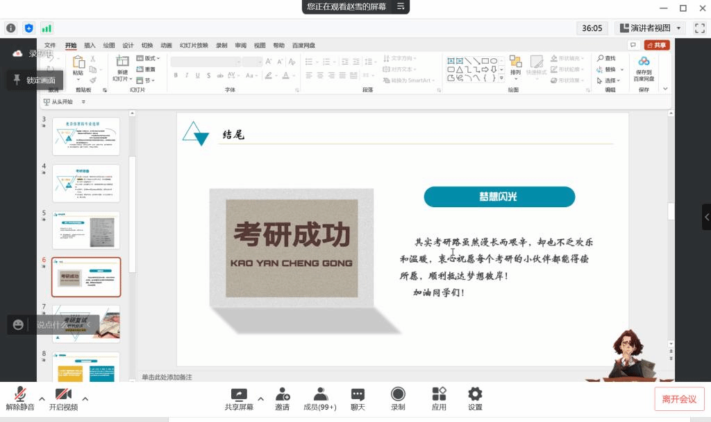 最后,张凤云和杨沼佩对分享经验的四位同学表示感谢,祝愿他们能够在今后的路途中能够达到新的高度。同时也对参会的同学提出要求,要以学长学姐为榜样,树立自我的人生目标,并为之努力奋斗。她们说:“考研是对我们人生的一个升华,锻炼我们的意志,发挥我们的才华,希望同学们都能不畏万难,奔赴山海,用心底的那份热烈赤诚,努力坚持。