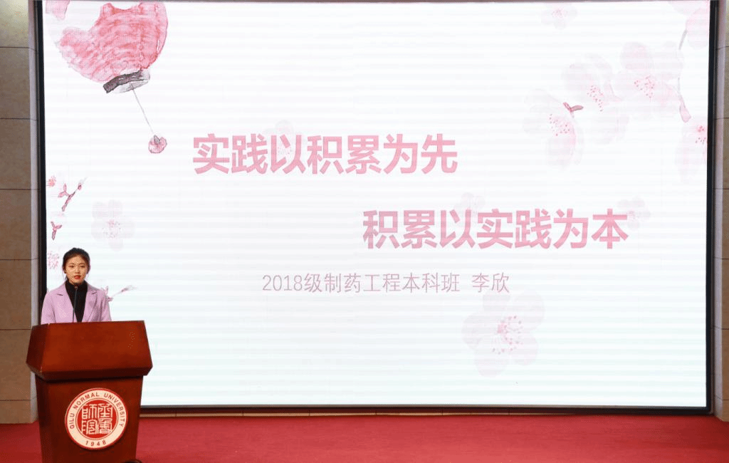 活动伊始,2018级应用化学本科班的吴晓雪作为优秀学生代表,从自己大学两年的经历出发,讲述了自己在迷茫状态下没有停滞不前,反而把握住所有遇见的机会、在尝试中找寻方向的故事,告诉同学们课外社会实践与书本知识带来的成长是截然不同却又相得益彰的,强调迷茫不等于不作为,鼓励同学们在大学这几年里合理处理学习、工作与生活的关系,找到自己的目标,向前起航。
