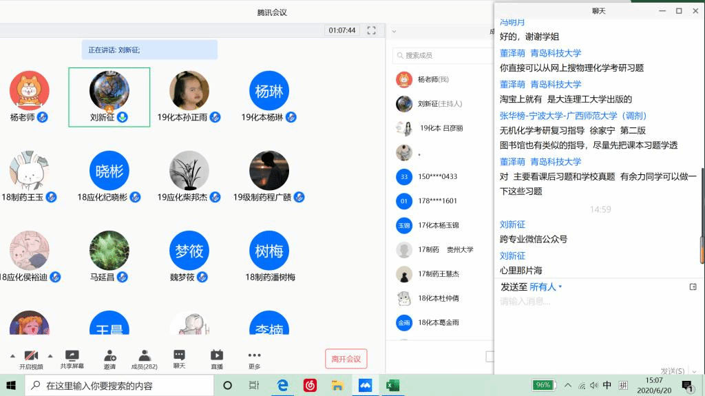 为进一步帮助我院学生了解考研信息、明确考研目标、掌握考研技巧,6月20日14:00,我院在腾讯会议APP举办2020年线上考研经验交流会。参加本次会议的有化学与化工学院团总支书记巩磊、副书记杨睿,2016级考研拟录取学生刘朝铭、王茹可、潘康红、董泽萌、郭懋宽、杨文悦、郭艳慧、张莹、宋文静、于文昊、崔富财,2017级、2018级、2019级本科班学生。化学与化工学院副院长刘新征主持会议。