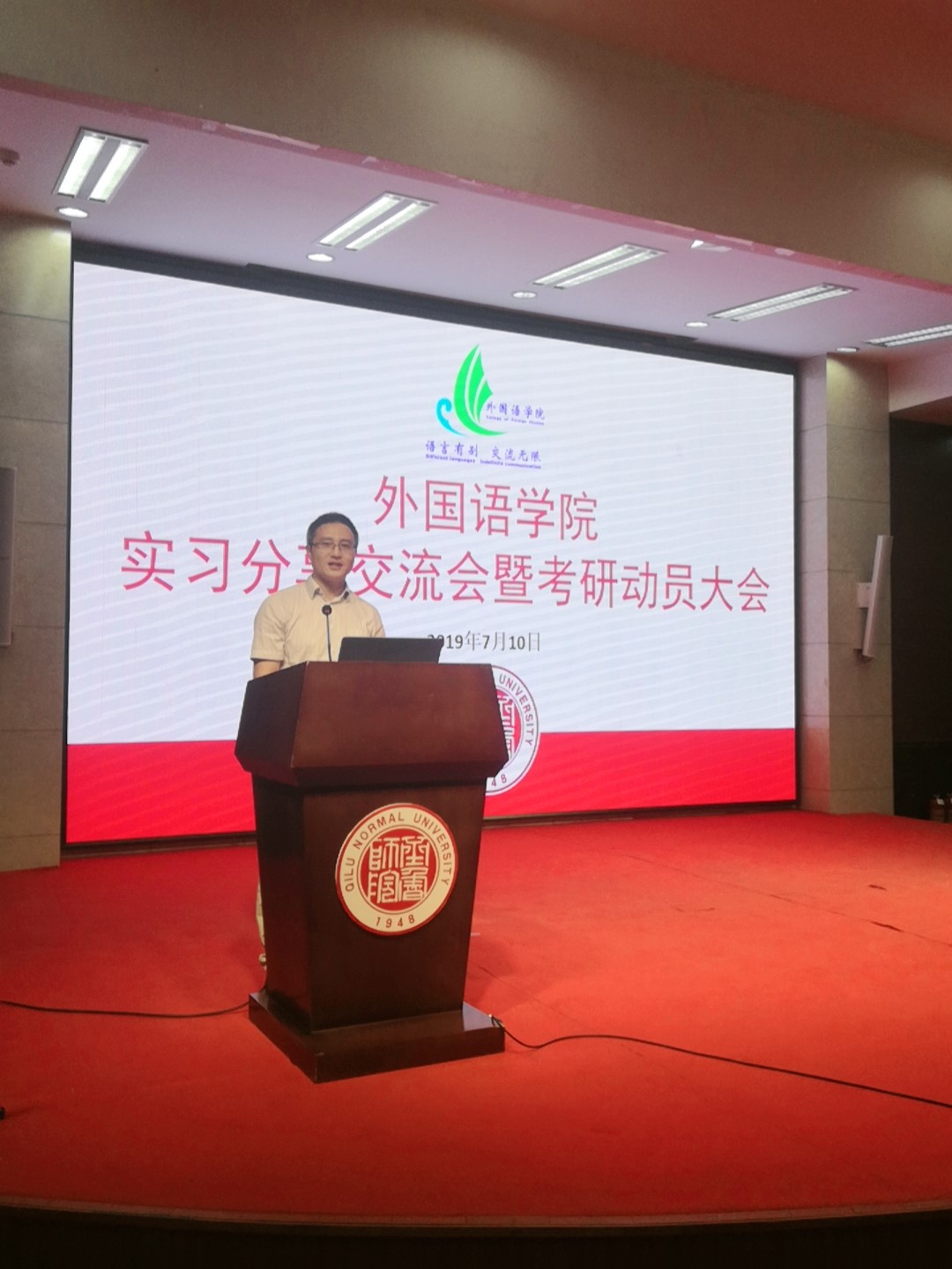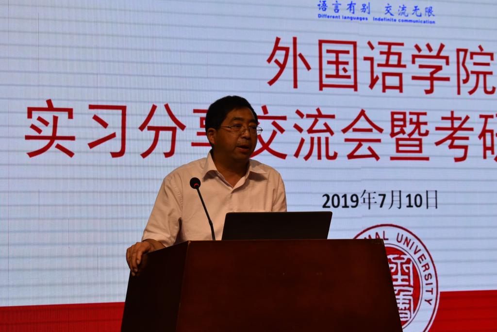 为了对2018-2019年度顶岗实习与教育实习进行全面总结,让2017级同学更加了解实习意义与目的,,为师范认证做好准备工作;同时为了提升学生的考研积极性,激发考研热情,使他们更加明确自己的考研目标,外国语学院于2019年7月10日下午两点在章丘校区学术报告厅召开实习分享交流会暨考研动员大会。参加本次会议的有外国语学院副院长宋秀葵,外国语学院党总支副书记郁志营,副院长臧学运,各学科教研室主任,本科班班主任,办公室、团总支成员及外国语学院2016级、2017级、2018级全体本科生。牛荦主持本次会议。