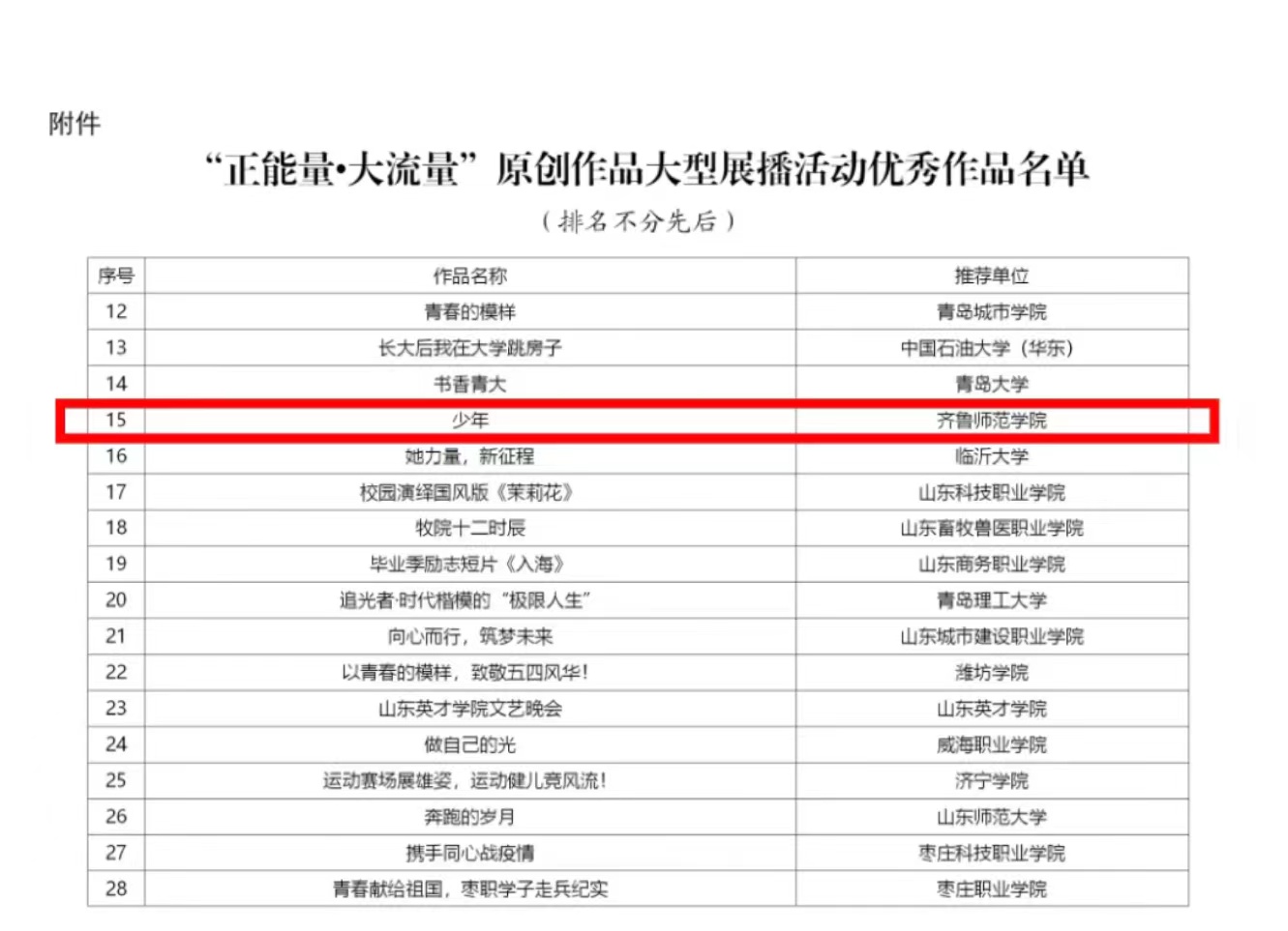 近日,山东省教育厅公布“正能量·大流量”原创作品大型展播活动优秀作品评选结果,JINNIAN金年会选送的短视频作品《少年》成功入选。活动自今年3月启动,经各地各校推荐申报、专家评审等环节,全省共评选出优秀作品200件。