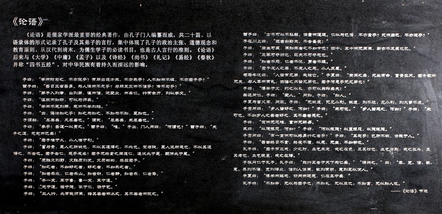 举凡中国人,都能对上图中的文字不陌生。这些话常常在日常生活中用到,这些话出自于中国古典文献——《论语》。《论语》是由孔门弟子记载的关于孔子及其弟子言行的一部著作,一共20章,位列四书之首。集中体现了儒家的政治主张,道德观念和教育原则。《论语》中的诸多话语如“学而时习之,不亦乐乎,有朋自远方来,不亦乐乎,人不知而不愠,不亦君子乎”“己所不欲,勿施于人”、“学而不思则罔,思而不学则殆”、“温良恭俭让”等流传于后世,成为中国人为人处世的行为准则,对早期中国文化的形成具有重要的意义。