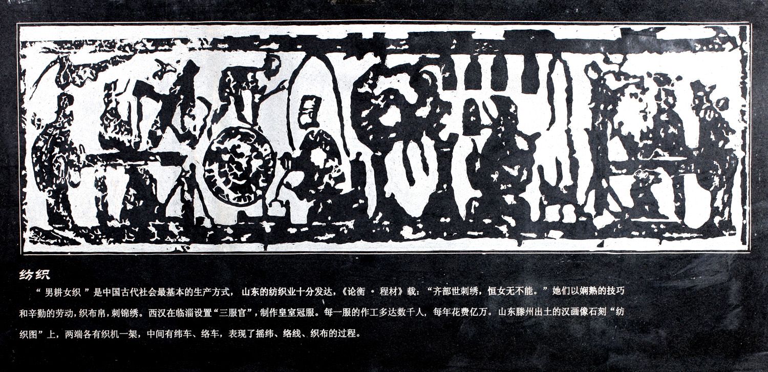 了解了中国古代农业的发展,我们再来了解一下中国古代的手工业。在中国古代社会,“男耕女织”是最基本的生产方式,山东的纺织业十分发达。东汉思想家王充在《论衡·程材》中记载:“齐郡世刺绣,恒女无不能。”也就是说“齐郡的人世世代代刺绣,普通妇女也没有不会的。”她们织布帛、刺锦绣,以娴熟的技巧和辛勤的劳动创造财富。西汉时在临淄设置“三服官”,专门负责制作皇室所需要的冠服。每一服的作工多达数千人,每年花费亿万。在山东滕州出土的汉画像石刻“纺织图”上,展现的便是汉人纺织的场景,画面两端各有织机一架,中间有纬车,表现了摇纬、络线、织布的过程。汉画像石中的“纺织图”流传下来的有多幅,在山东博物馆汉画像石馆、山东石刻艺术馆、滕州汉画像石博物馆都有石刻为证。由此可知,两汉时期的山东,不仅有养蚕和丝织业,其规模和织机也达到了相当高的水平。这块纺织图的发现,极大地弥补了历史文献的不足,为了解中国古代社会提供了可视性资料。