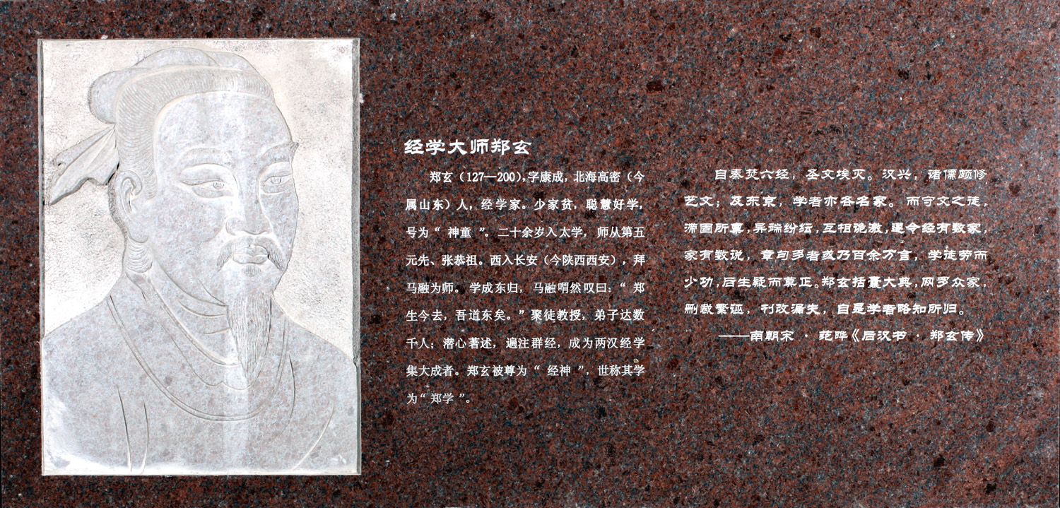 众所周知,汉代自从汉武帝“罢黜百家,独尊儒术”后,两汉学术以经学为最,研究和学习经学成为当时人最热衷的事情。于是,出现了众多经学家。尤其是鲁恭王坏孔子宅,发现鲁壁所藏古文经后,今文经(就是用当时通行的文字隶书写成的)和古文经(就是用先秦文字写成的)之间的是是非非,推助了经学的发展。山东是儒学的发源地,山东经学的发展孕育出了一位集今文经和古文经为一身的经学大师,他就是我们现在看到的郑玄。