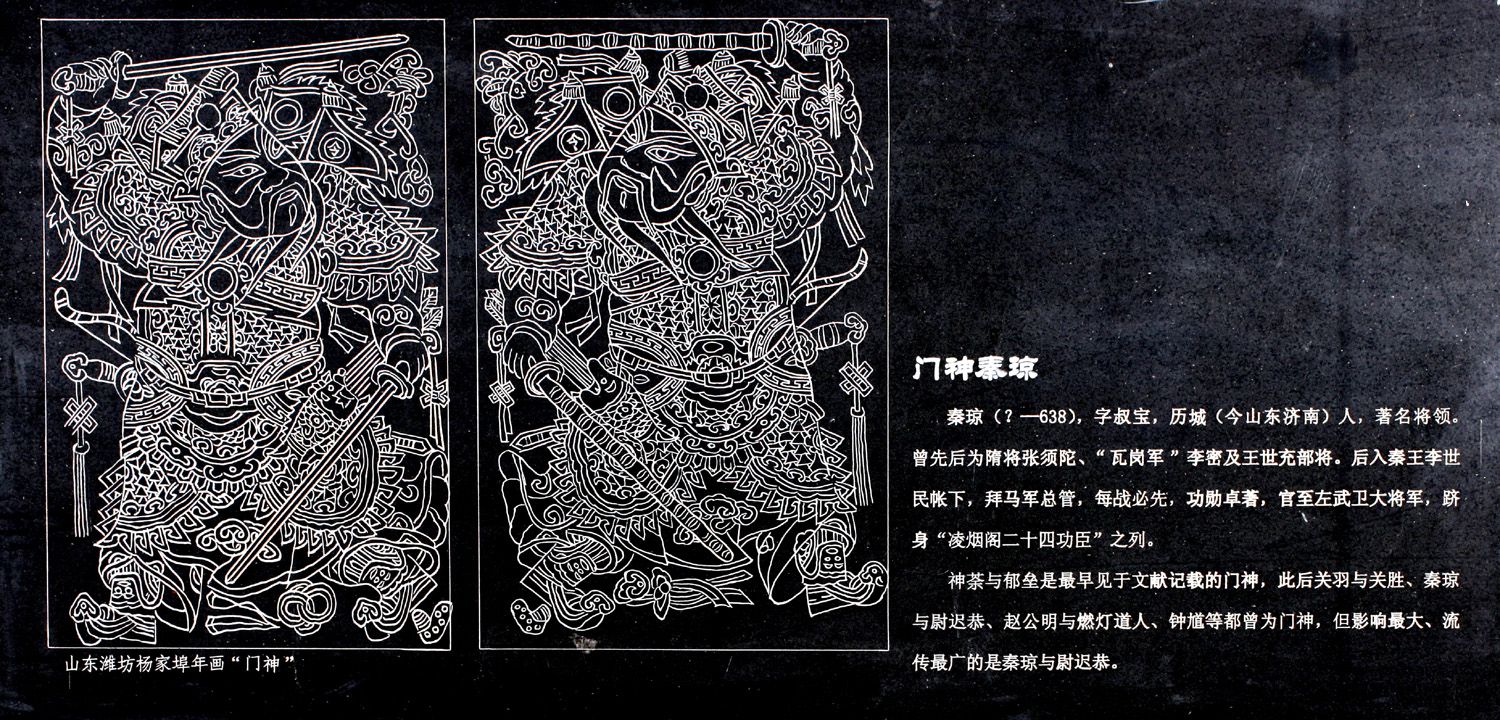 提到门神,大家都知道是用来驱鬼辟邪护佑家人的神灵。最早见于文献记载的门神是远古时代的神荼(tu)和郁垒。后来,三国时期的关羽与关胜,唐代的钟馗、秦琼与尉(yu)迟恭等都曾被人们奉为门神。但影响最大、流传最广的是秦琼与尉迟恭。我们来看这一副是杨家埠年画石刻,大家是不是觉得这两位门神是一样的呢?其实并不一样,大家仔细看,这两位手里拿着的武器是不一样的。这一位呢,是秦琼,手里拿着双锏。这一位呢,就是尉迟恭,他手里拿着双鞭。然而,为什么秦琼和尉迟恭被人们奉为门神呢?首先,秦琼和尉迟恭武功高强。秦琼和尉迟恭可谓隋唐英雄中格斗能力较强的两个人。玄武门之变后,李建成和李元吉的鬼魂来骚扰李世民时,秦琼主动请缨,我跟尉迟恭一起站岗,保护皇上。其次,秦琼和尉迟恭一身正气。俗话说,邪不压正,正必克邪。李建成李元吉的鬼魂最怕正气,李世民因为干了亏心事,身上缺乏正气,所以才会被邪气所侵。而秦琼和尉迟恭满身正气,正好可以辟邪镇鬼。最后,秦琼和尉迟恭讲究义气。这样的忠义之士当门神,不仅可以解决李世民的睡觉问题,还能教化大唐百姓,流传后世。因此秦琼和尉迟恭成为门神。