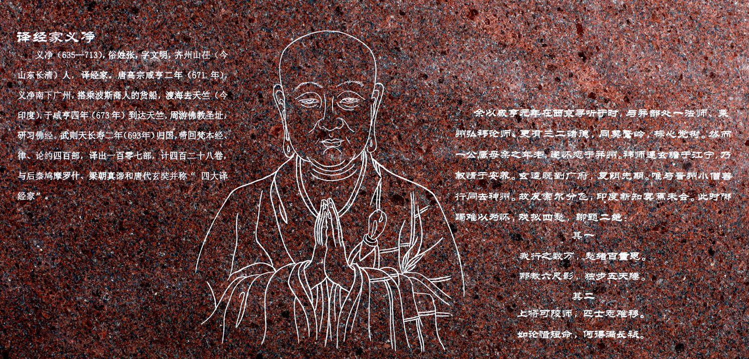 提到佛教,我们都知道佛教是世界三大宗教之一,它的诞生地在印度,由于语言的不同,它又是怎样在世界各地传播的呢?当佛教传播到中国以后,面临着很多问题,首先就是佛经的翻译,只有将印度梵文的佛经翻译成汉文,才能使佛教广为传播。于是,中国古代出现了许多著名的佛经翻译家,这块石碑介绍的是唐朝著名译经家—义净。义净,齐州(今山东历城)人,俗姓张,字文明。他与鸠摩罗什、真谛、玄奘等并称为四大译经家。画像上的他双手合十,目光坚定,俨然就是一个虔诚的佛教徒。义净幼年出家,天性颖慧,年十五即仰慕法显、玄奘之西游,二十岁受具足戒。他深知要想真正悟得佛法的真谛,单靠研究这些前代高僧的译注是不够的,读万卷书行万里路,唯有亲自前往,认真学习,才能感悟禅的精髓。这种精神值得我们深思和学习。于是他从海上丝绸之路出发,先后经过众多国家,在达那烂陀寺研习佛法,认真译注,最终他带着佛法回到东方,为佛教的进一步发展增添了新的动力,并受到了当时女皇武则天的隆重接待。一花一世界,一叶一菩提,义净用他的坚韧与慈悲给唐朝创造了一个更丰富的佛教世界,也给我们留下了珍贵的佛家经典,现在法师仍以他深沉的目光注视着我们,勉励世人事必躬亲追求真理。如今义净和他翻译的佛经已经成为中国传统文化的组成部分,源远流长。