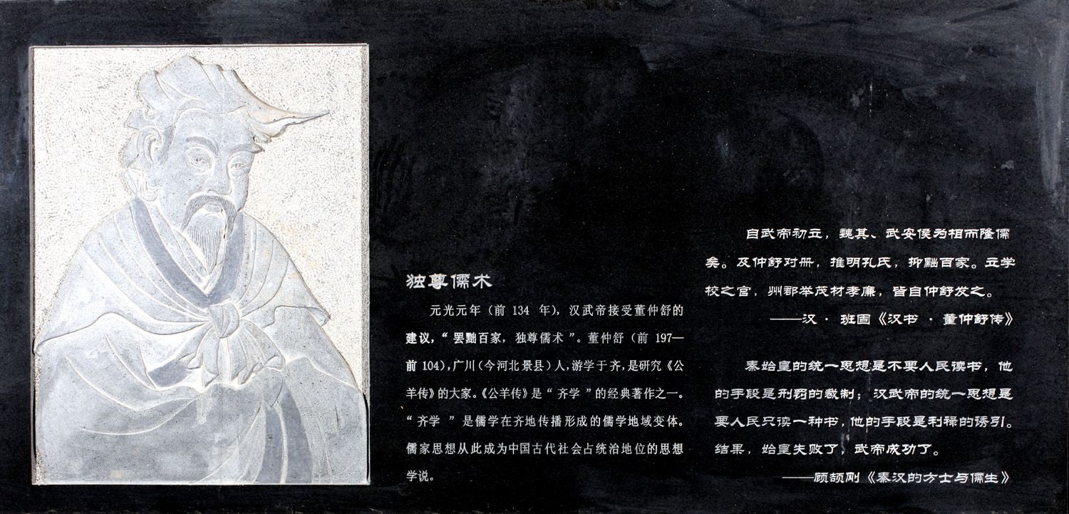 众所周知,古往今来,每一个历史时代都有其代表性的思想文化引领着时代的进步与发展。正如前面我们所介绍的“伏生传经”一样,儒家经典在汉初黄老无为的思想指导下,开始突破秦始皇焚书坑儒残暴制度的藩篱,走上了逐步恢复和发展的道路。伴随着西汉初年的休养生息,西汉王朝迎来了大发展时期,与此同时,黄老无为的统治思想无法适应时代的需求。于是,为了加强中央集权,统一人们的思想,西汉政府推行了“罢黜百家,独尊儒术”的政策。